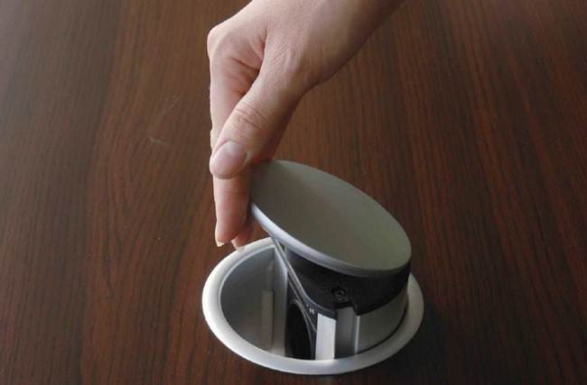 Встраиваемые розетки на кухне – в фартуке или в столешнице. В пассивном состоянии они прикрыты крышечкой. При необходимости крышечка нажатием на нее открывается. Практикуется для обеденной и рабочей зоны.